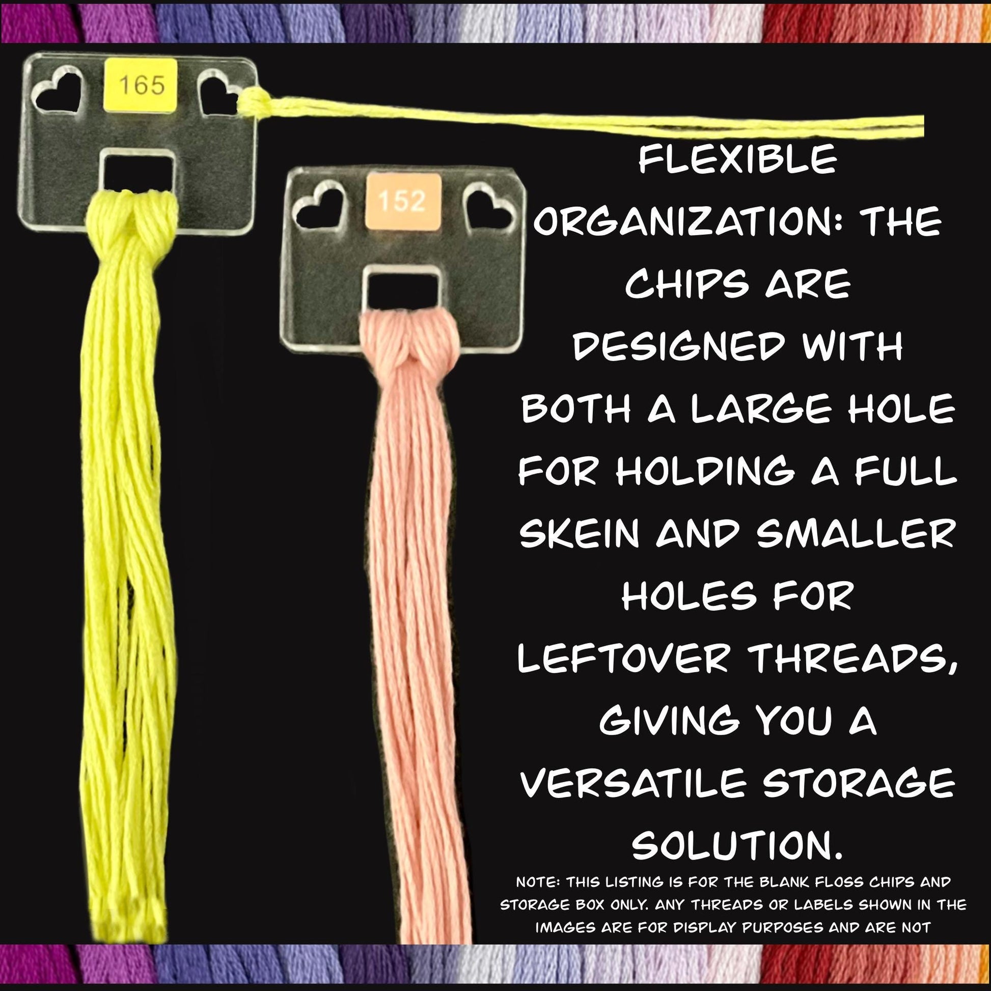 Note: This listing is for the blank floss chips and storage box only. Any threads, rings, or labels shown in the images are for display purposes and are not included.