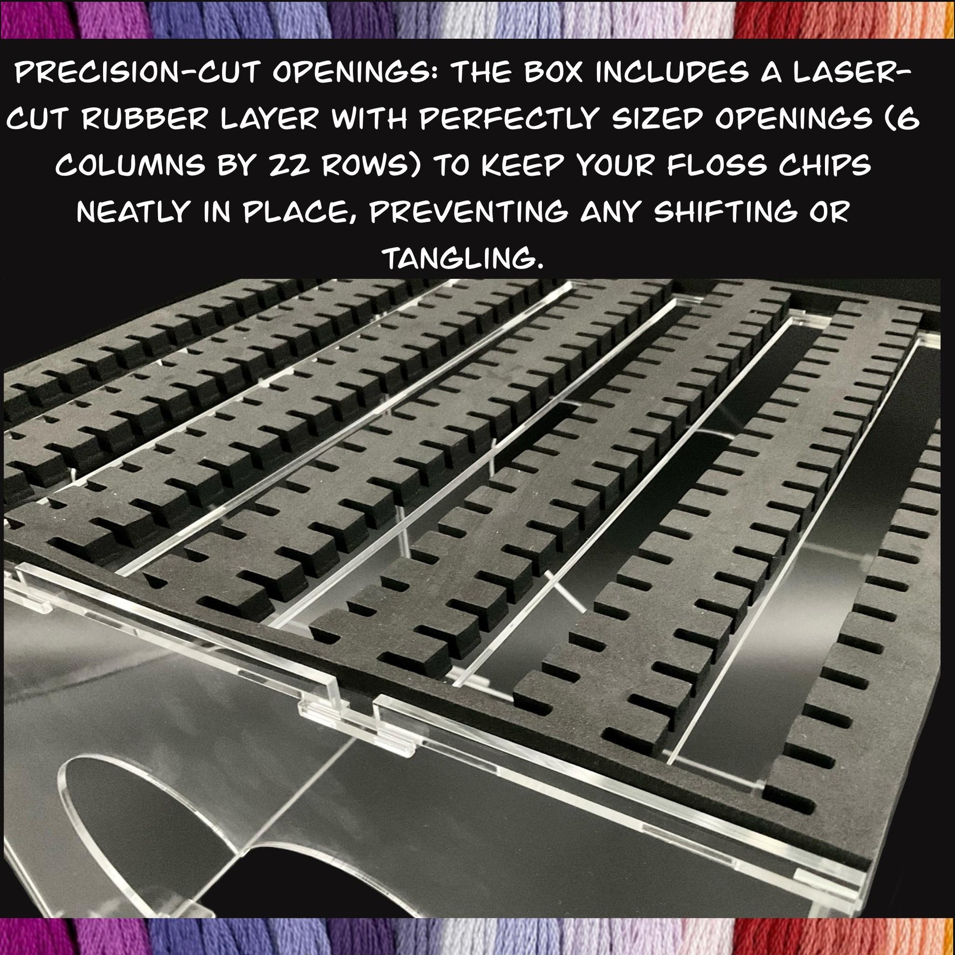 🌟 Precision-Cut Openings: The box includes a laser-cut rubber layer with perfectly sized openings (6 columns by 22 rows) to keep your floss chips neatly in place, preventing any shifting or tangling.