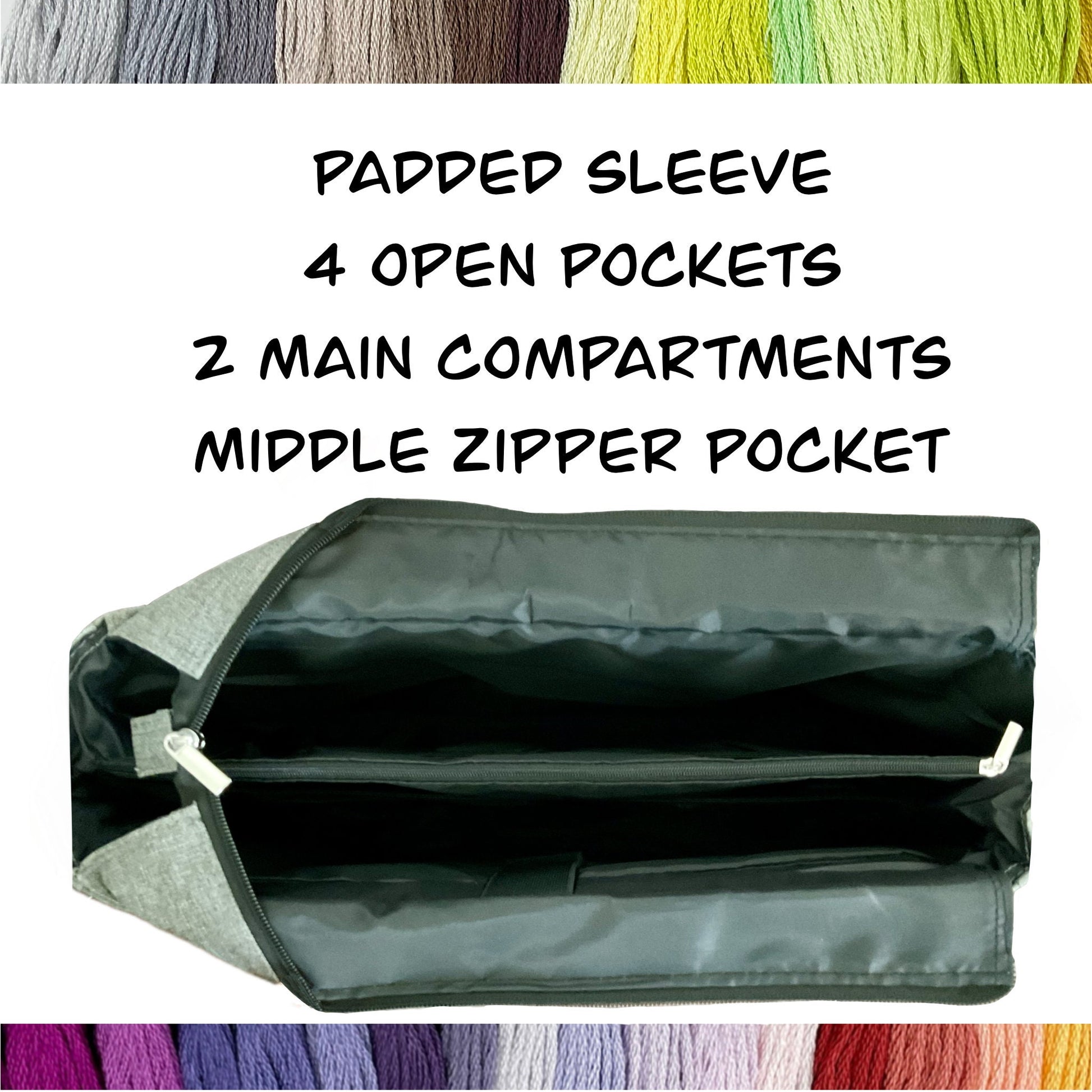 TOTE ORGANIZER HAS MORE THAN 10 POCKETS. Zipper will reliably store your embroidery hoops, floss kit, and fabric, and four open pockets will keep in place your thread organizers, cross stitch, and much more.