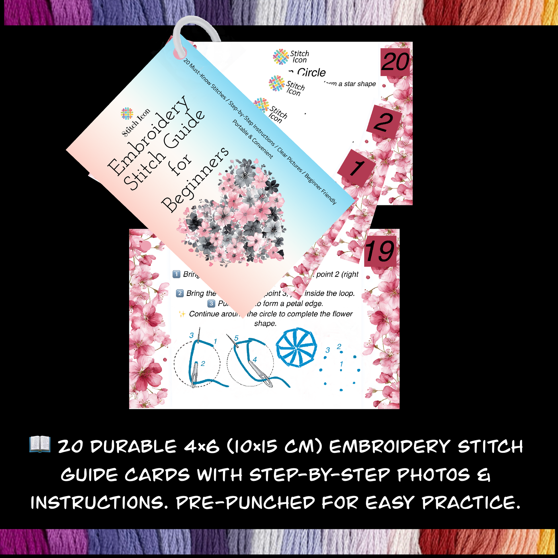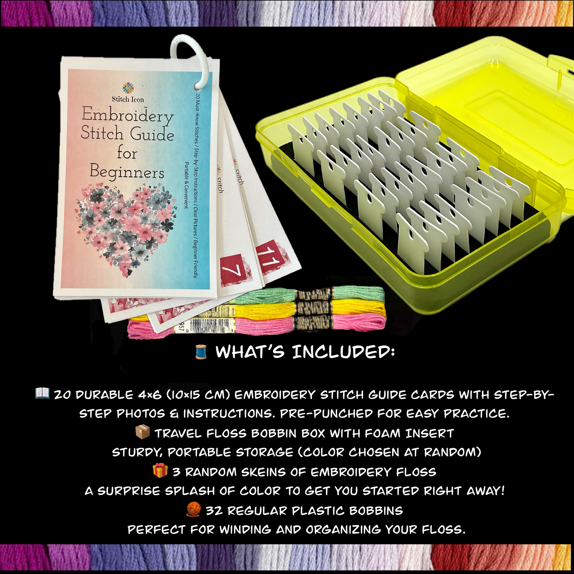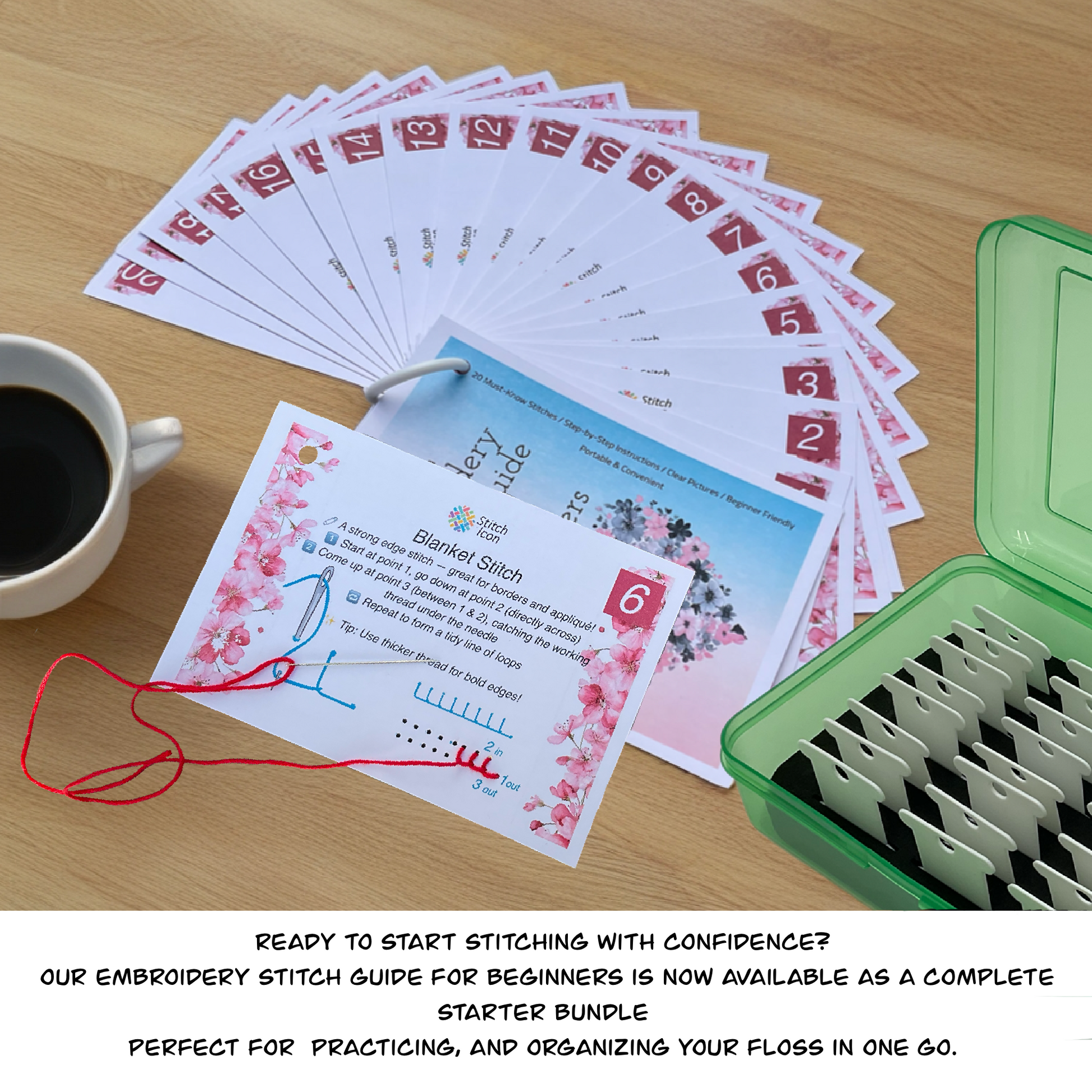 Ready to start stitching with confidence? Our Embroidery Stitch Guide for Beginners is now available as a complete starter bundle—perfect for learning, practicing, and organizing your floss in one go.