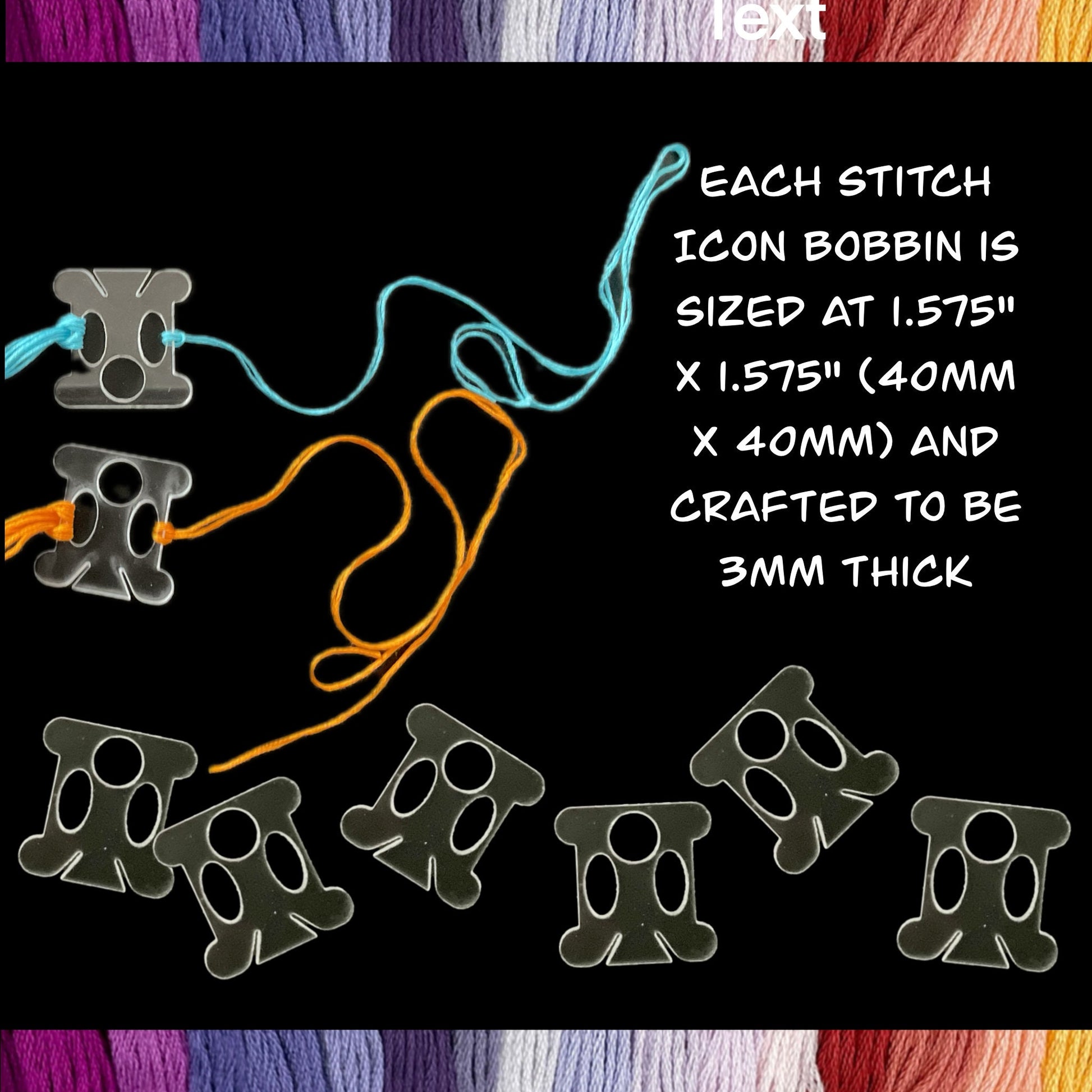 Each Stitch Icon bobbin is meticulously sized at 1.575" x 1.575" (40mm x 40mm) and crafted to be 3mm thick, providing robust support for your embroidery floss. Equipped with a substantial 12mm diameter hole, these bobbins offer effortless floss ring storage and quick thread access. Additionally, the inclusion of two oval openings (15x7.5mm each) allows for seamless management of leftover floss bits, ensuring no thread goes to waste. Designed with practicality in mind, the Stitch Icon bobbin shape simplifies both winding and storage, making your crafting experience as smooth as possible.