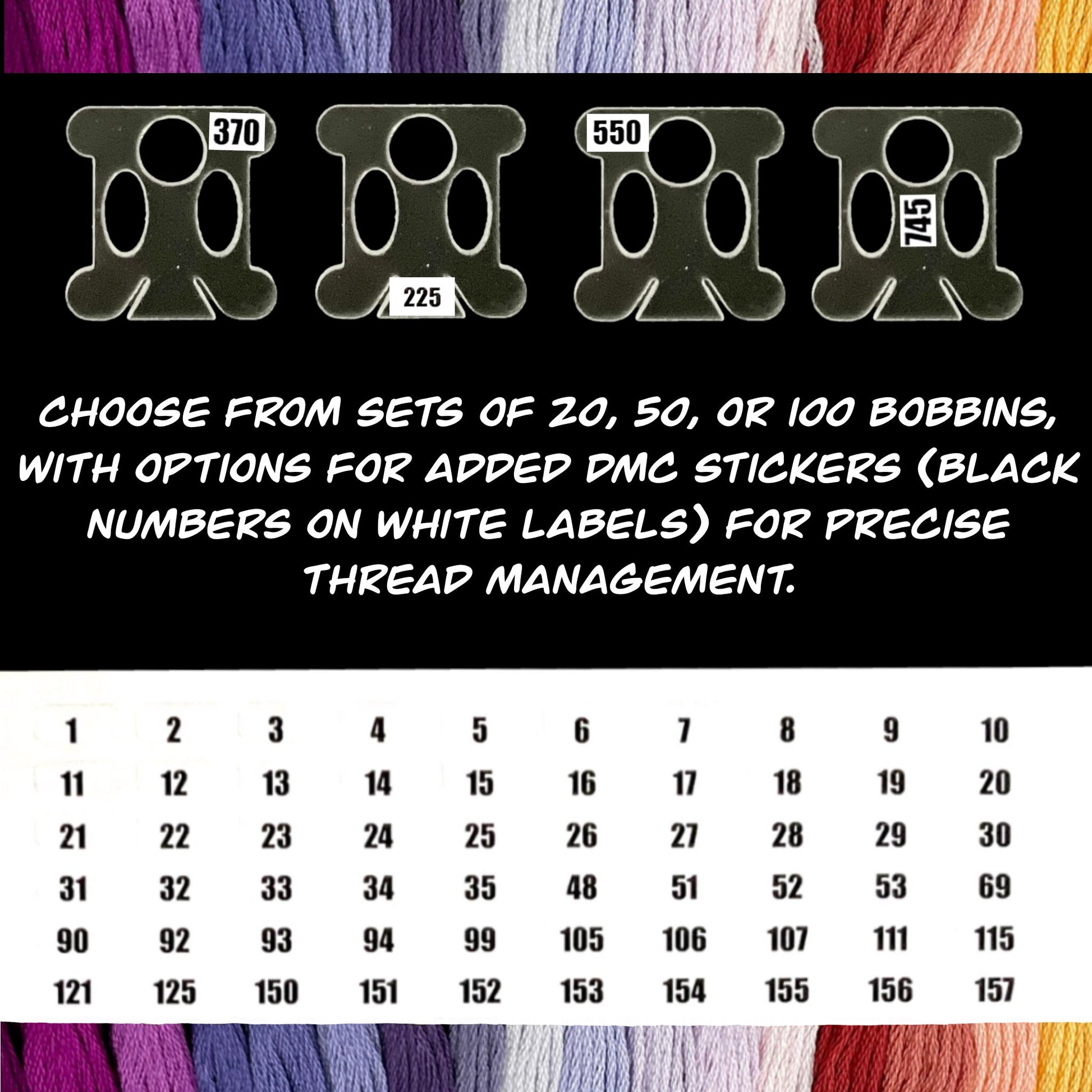 📏 Generous Capacity: Organize your skeins effortlessly. Choose from sets of 20, 50, or 100 bobbins, with options for added DMC stickers (black numbers on white labels) for precise thread management.