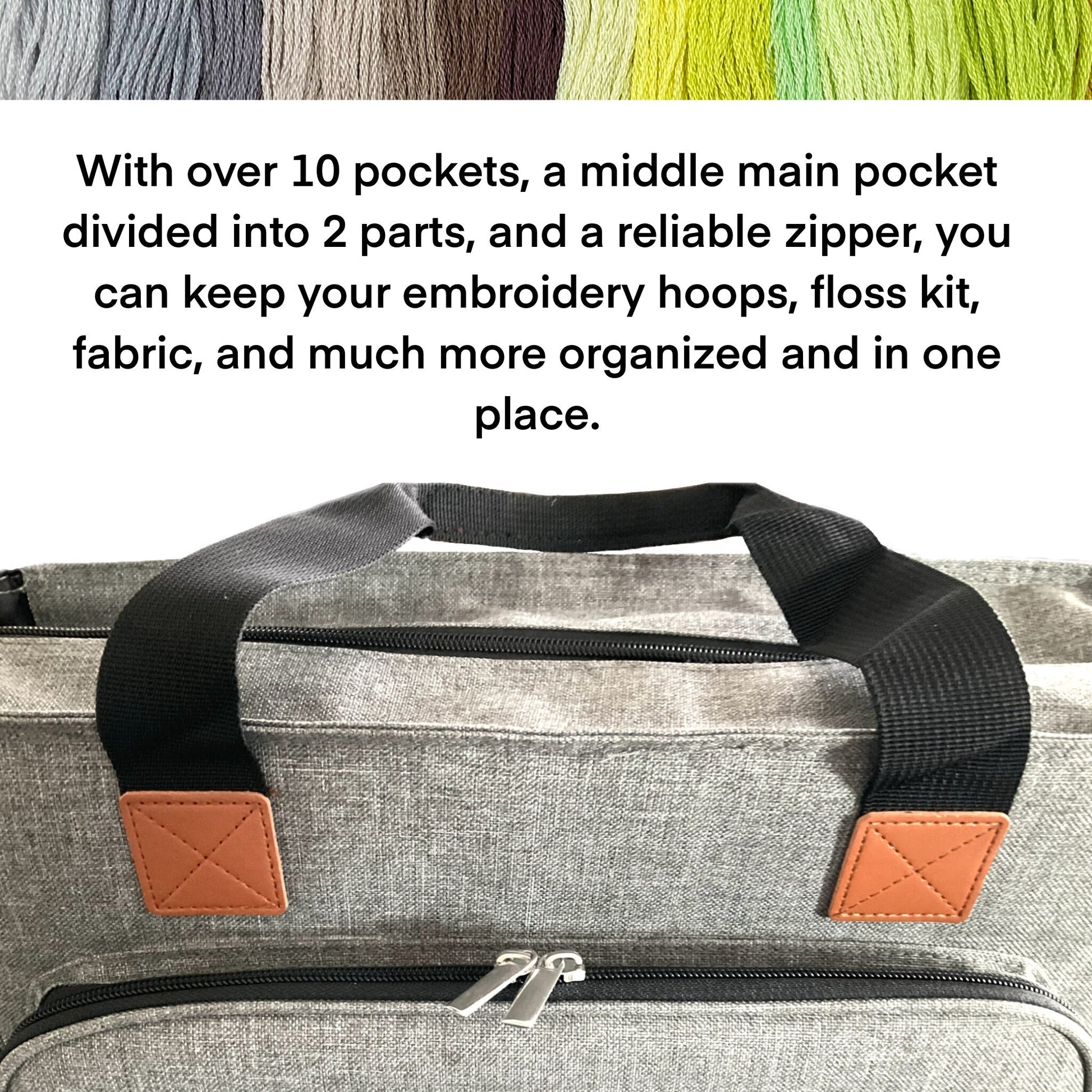 TOTE ORGANIZER HAS MORE THAN 10 POCKETS. Zipper will reliably store your embroidery hoops, floss kit, and fabric, and four open pockets will keep in place your thread organizers, cross stitch, and much more.
