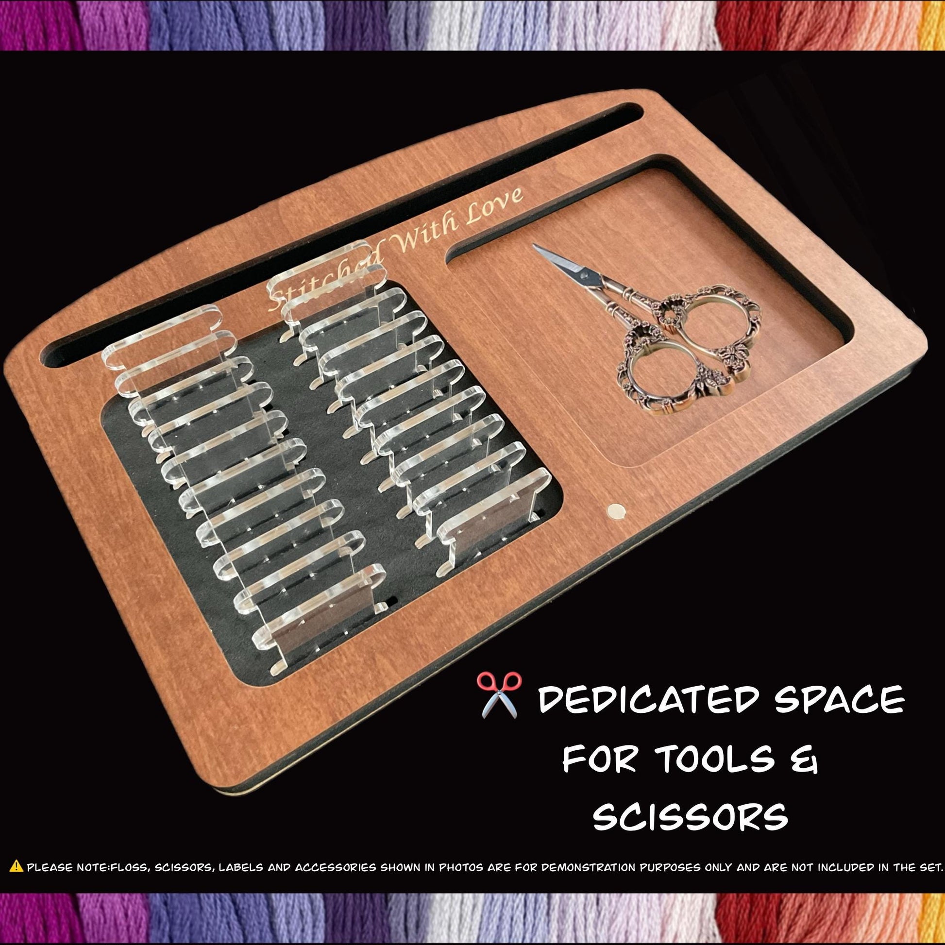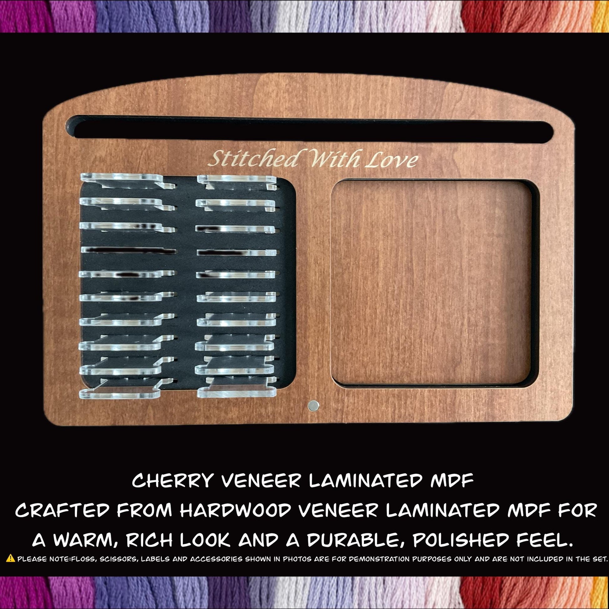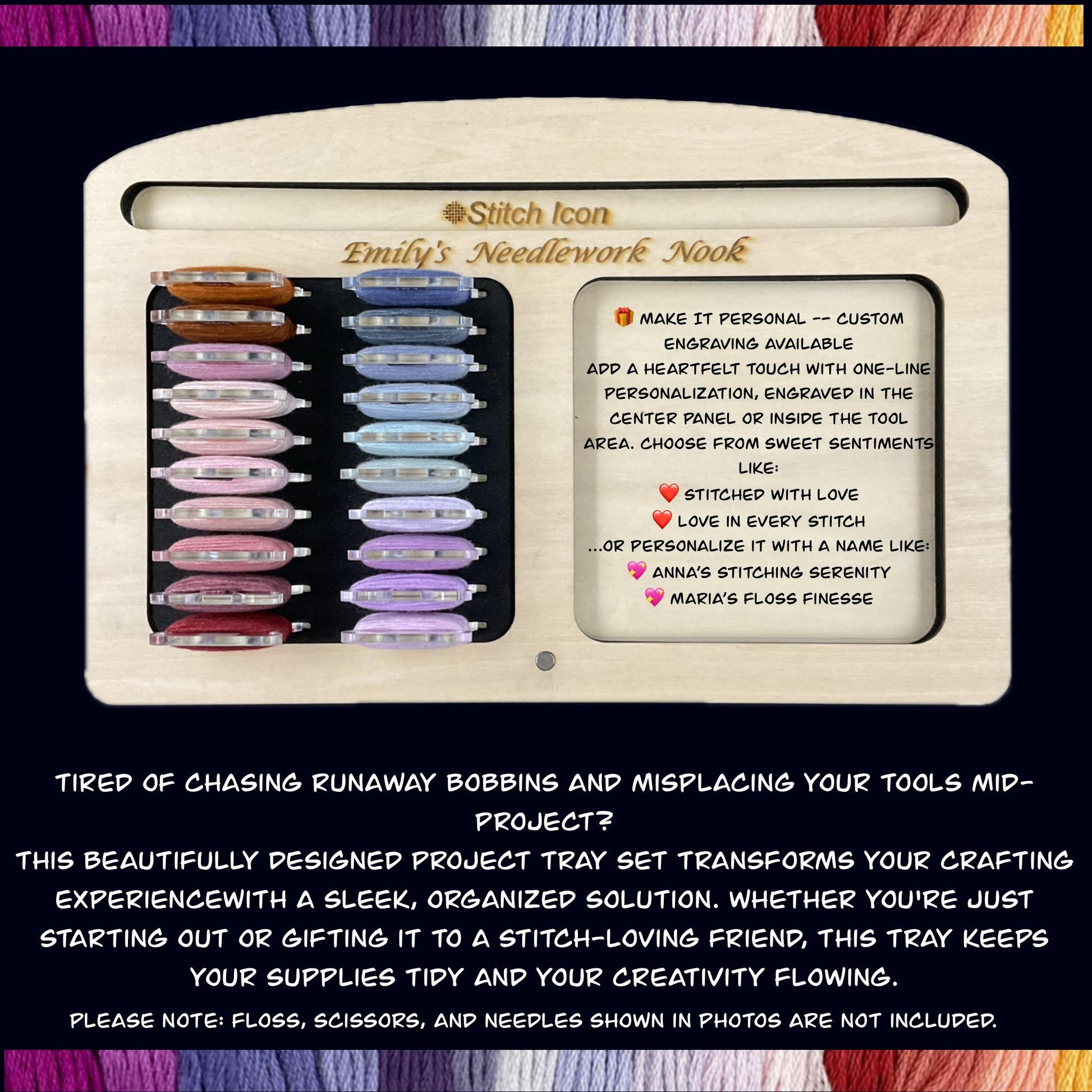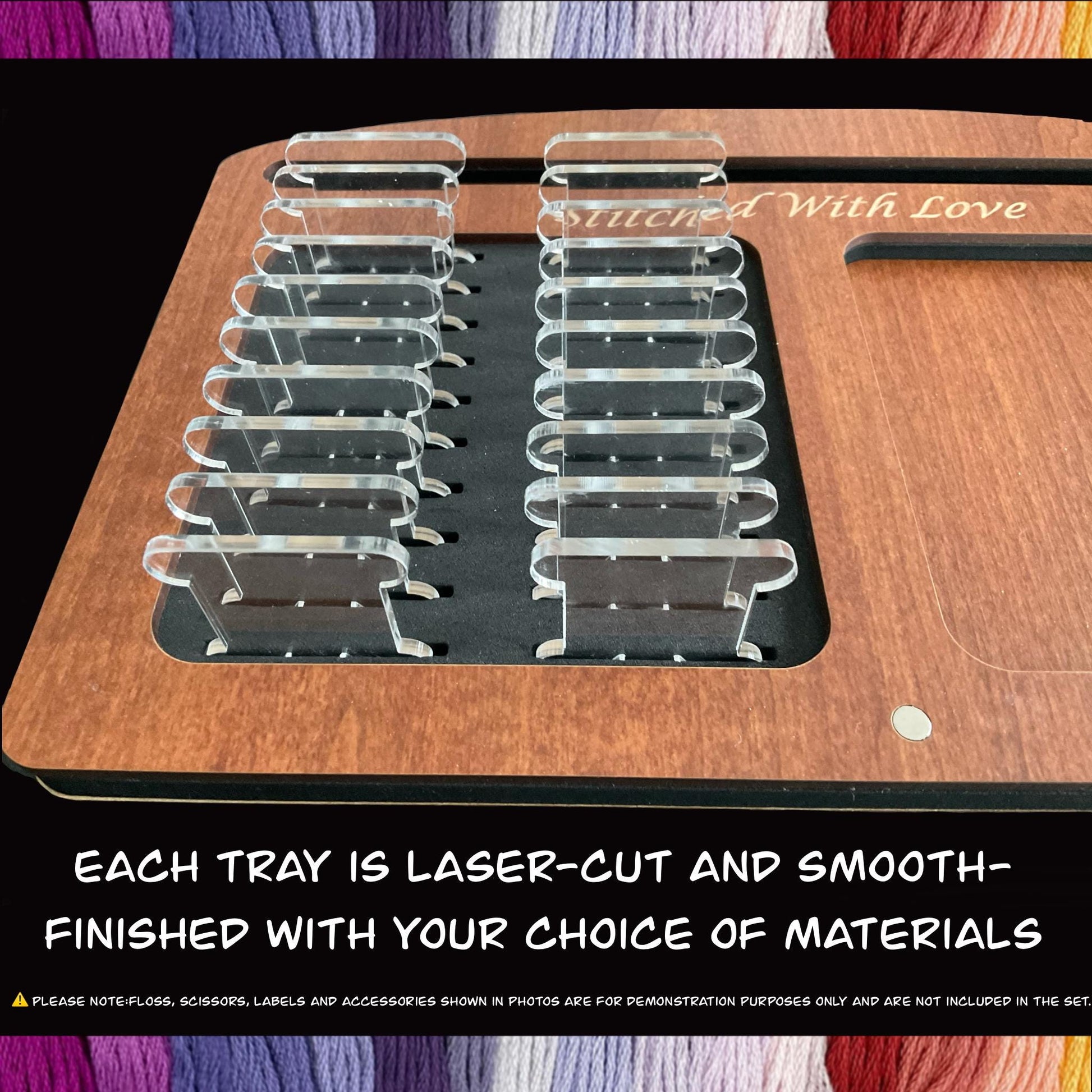 • Project Tray + 20 Clear Acrylic Bobbins – Includes 20 durable 3mm acrylic bobbins that fit snugly into precision-cut slots. Perfect for a sleek, modern look and long-lasting use.