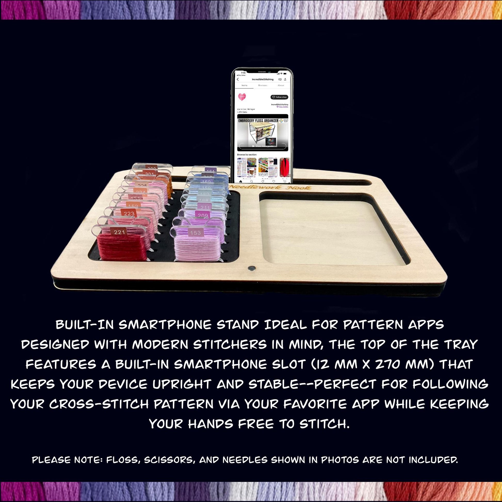 Designed with modern stitchers in mind, the top of the tray features a built-in smartphone slot (12 mm x 270 mm) that keeps your device upright and stable—perfect for following your cross-stitch pattern via your favorite app while keeping your hands free to stitch.