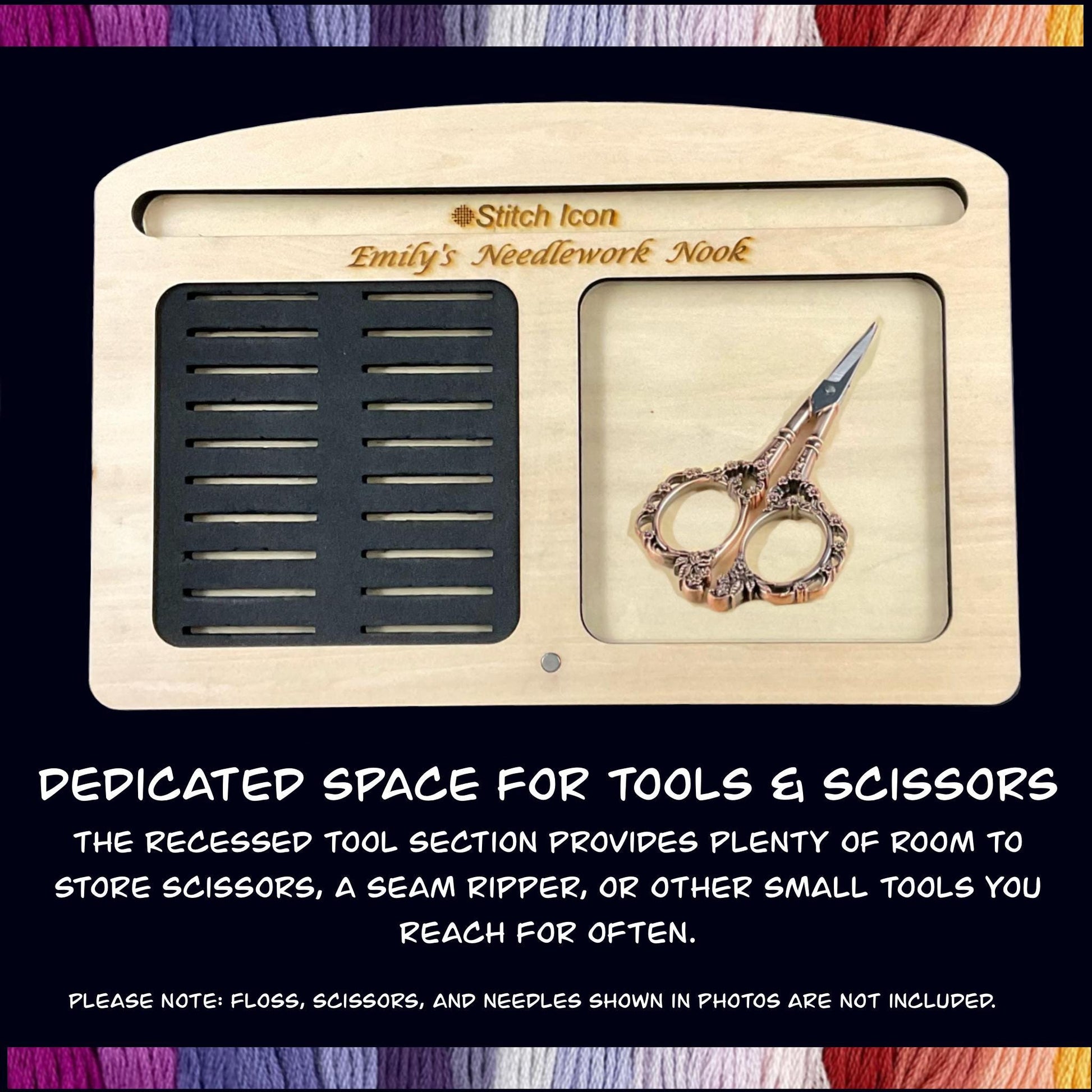 The recessed tool section provides plenty of room to store scissors, a seam ripper, or other small tools you reach for often.