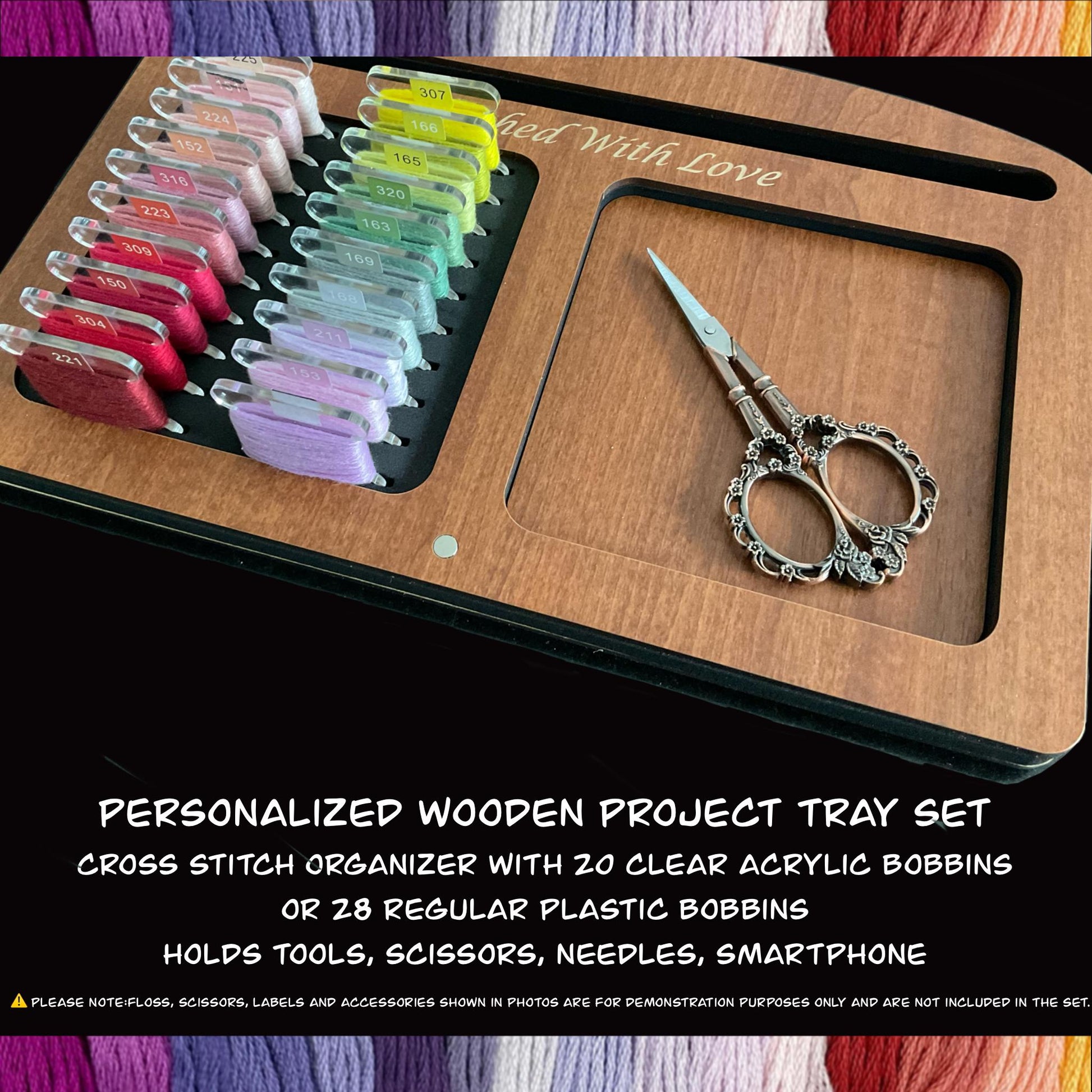 Wooden Project Tray Set–Cross Stitch Organizer with 20 Clear Acrylic Bobbins–Holds Tools,Scissors,Needles–Mother's Day Gift