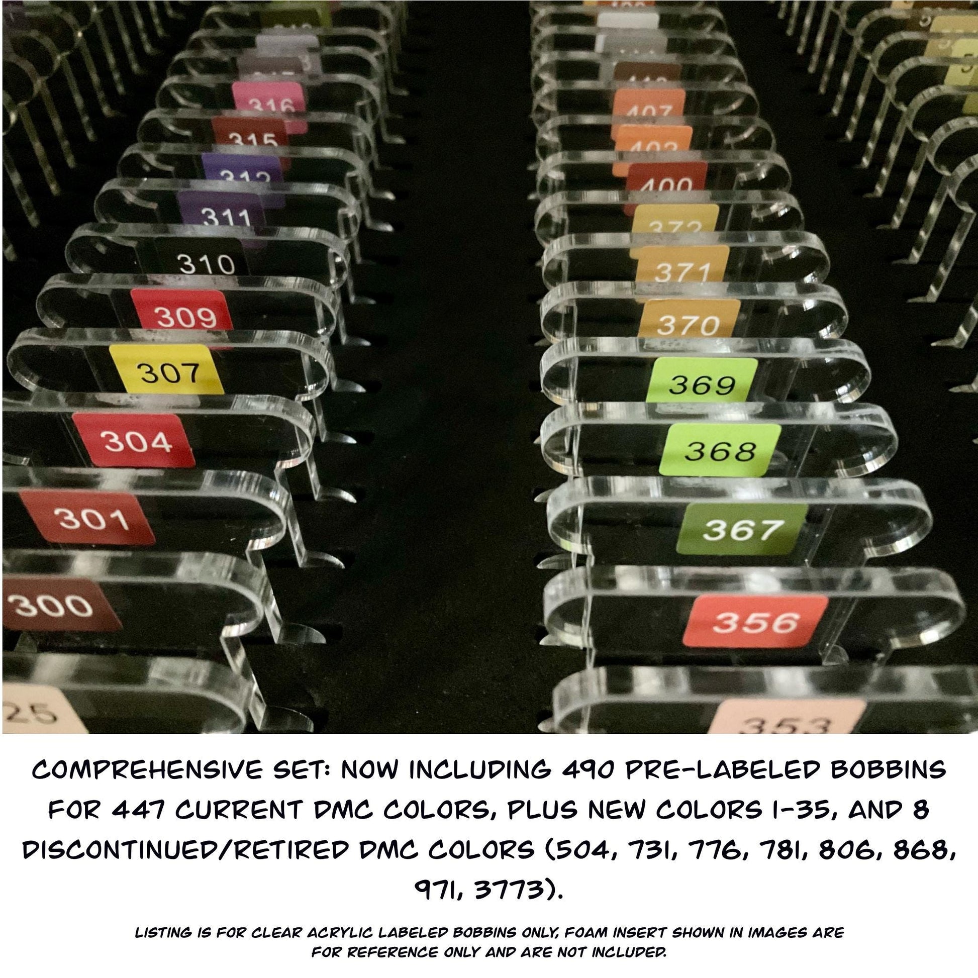 Total Bobbins: 490 pre-labeled bobbins, covering 447 current DMC colors + new colors 1-35 + 8 discontinued/retired colors (504, 731, 776, 781, 806, 868, 971, 3773)