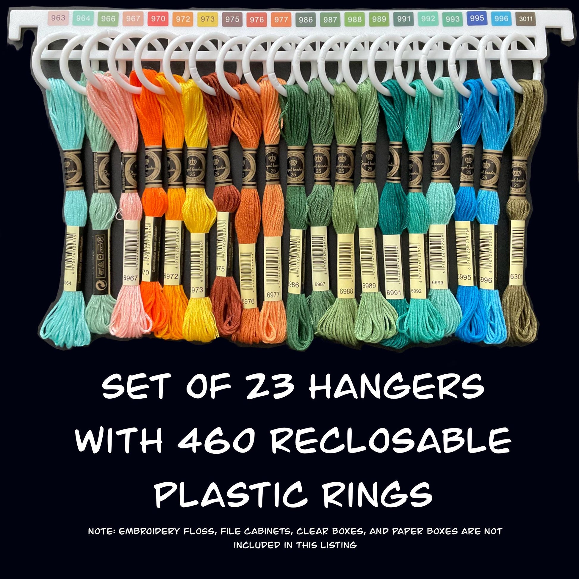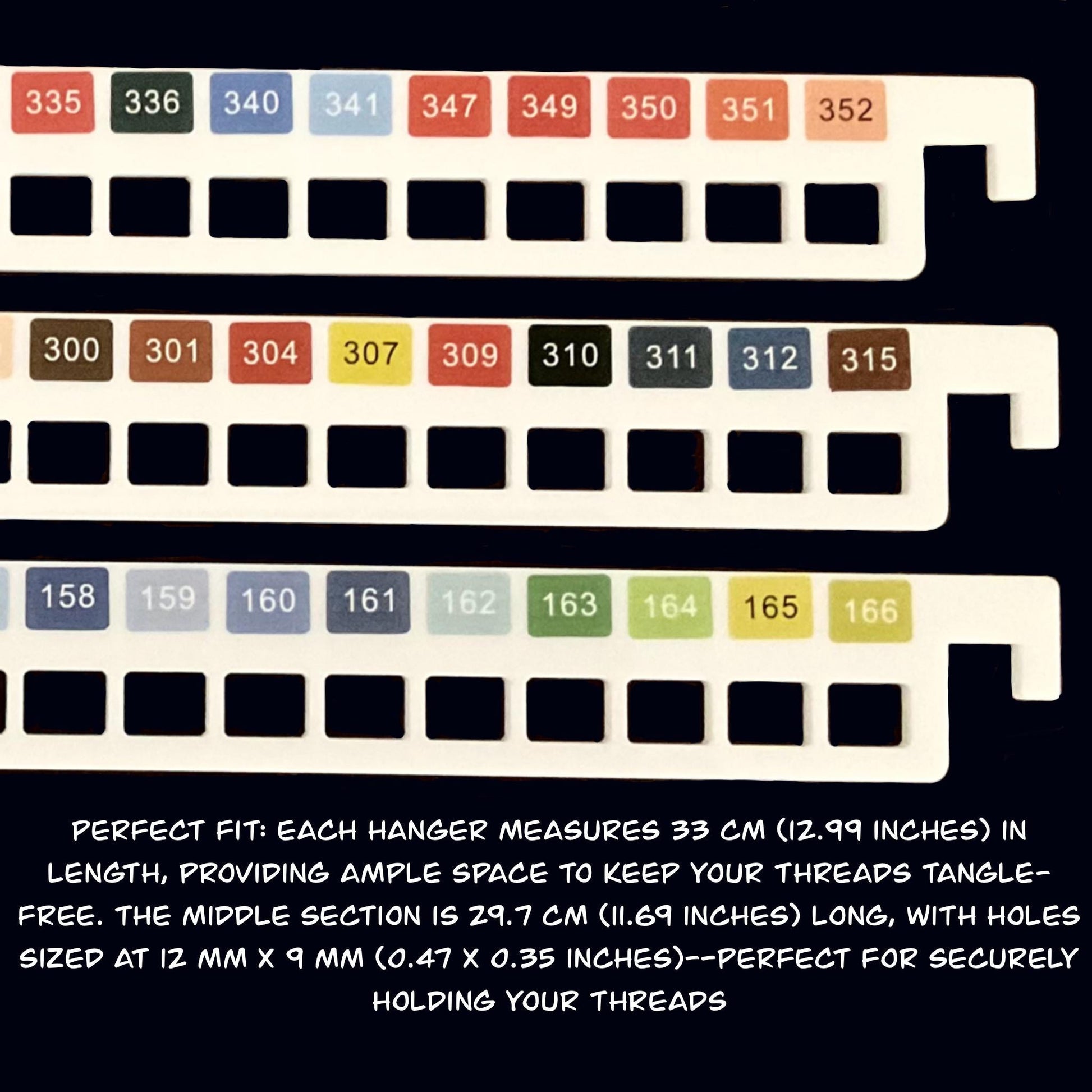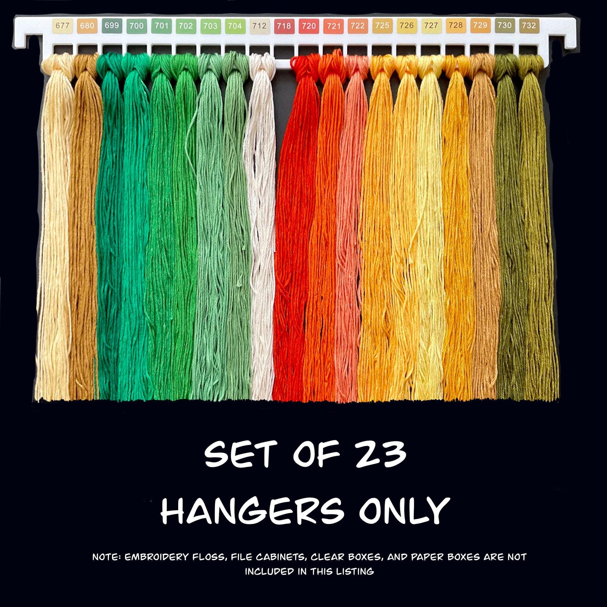 Elevate Your Embroidery Space: Transform your stitching area with our set of 23 white acrylic pre-labeled floss hangers, thoughtfully designed to organize and display all 447 DMC thread colors. These hangers are crafted to enhance your embroidery experience, making it smoother and more enjoyable.