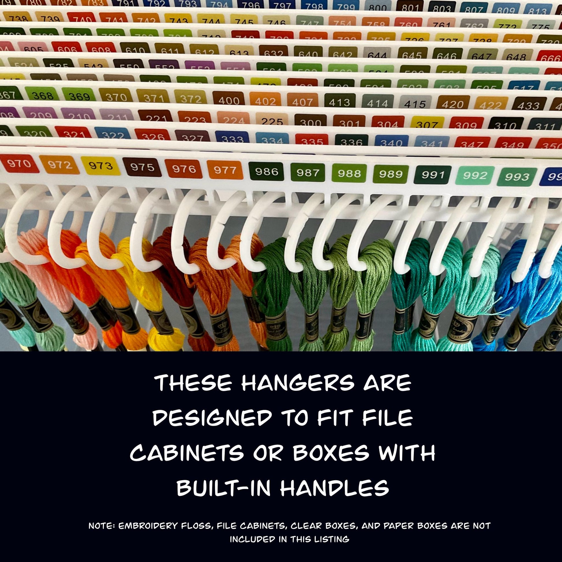 ✨ Perfect Fit: Each hanger measures 33 cm (12.99 inches) in length, providing ample space to keep your threads tangle-free. The middle section is 29.7 cm (11.69 inches) long, with holes sized at 12 mm x 9 mm (0.47 x 0.35 inches)—perfect for securely holding your threads. These hangers are designed to fit file cabinets or boxes with built-in handles (note: embroidery floss, file cabinets, clear boxes, and paper boxes are not included in this listing). You can find compatible options by checking the link below:
