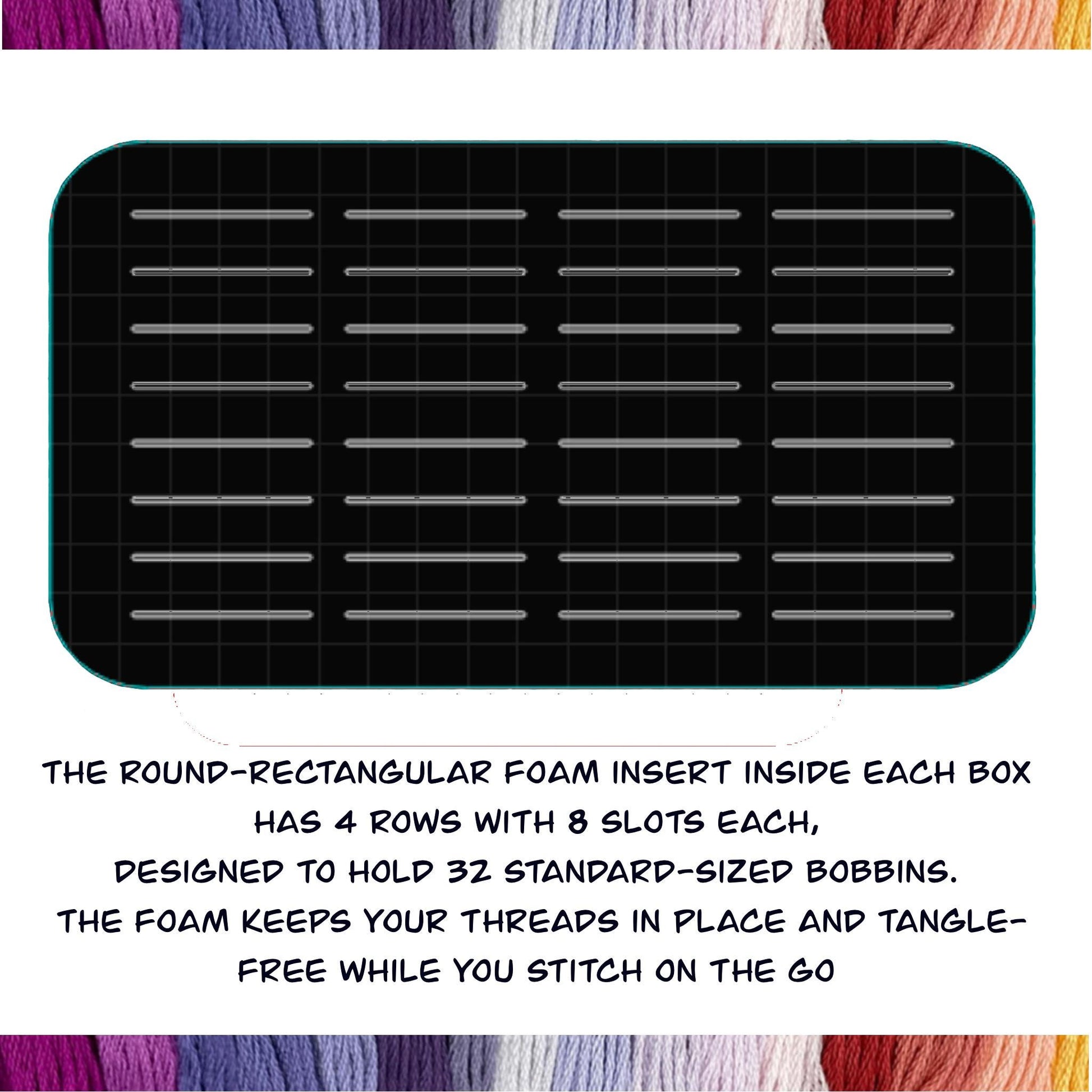 The round-rectangular foam insert inside each box has 4 rows with 8 slots each, designed to hold 32 standard-sized bobbins. The foam keeps your threads in place and tangle-free while you stitch on the go. 💡